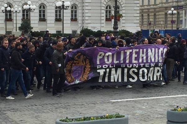 Arădenii sunt nemulţumiţi de faptul că jandarmii (de altfel, în majoritatea lor timişoreni) le-au permis suporterilor celor de la ASU Poli să parcurgă traseul Gara CFR – Aradul Nou prin centrul oraşului. „Alb-violeţii” nu au ratat momentul să se pozeze chiar în faţa Primăriei, într-un gest de aroganţă la adresa rivalilor.