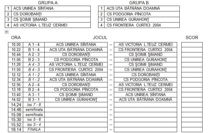 Deocamdată, vorbim despre Memorialul Nicolae Ardelean, ajuns la ediția a VI-a, ce va aduce față în față opt echipe de juniori formate din jucători născuți în anii 1998 și mai mici. Competiția va avea loc duminică și are următorul desfășurător: