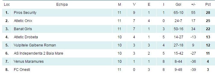 La 6 puncte peste locul 3, liderul Piroș Security mai are nevoie de doar trei puncte din tot atâtea partide pentru a-și asigura promovarea matematică. Acestea ar putea sosi chiar pe 7 mai în „fieful” formației de pe locul 2, Atletic Onix. „Jucăm din ce în ce mai bine, câteodată fetele mă surprind și pe mine. Au chef de fotbal, încearcă tot felul de faze și execuții și le cam ies. Avem două săptămâni să ne pregătim de derby, căci am dori să încheiem cât mai repede conturile și să realizăm obiectivul”, a explicat Gheorghe Cameniță, căruia fetele i-au făcut un frumos cadou de ziua de nume.