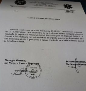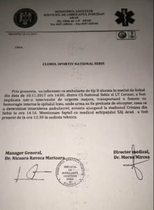 Pe de altă parte, Național Sebiș a și obținut adrese de la Serviciul Județean de Ambulanță Arad, în care acesta confirmă cazul de forță majoră pentru care cea de-a doua Ambulanță nu a ajuns la teren. „Noi, la ora 12,45, când am sesizat faptul că doar medicul delegat e la stadion, nu și Salvarea, am sunat la Arad pentru a solicita o altă mașină. Ni s-a spus că nu sunt disponibile, dar că respectiva Ambulanță plecată la Ineu cu femeia ce avea hemoragie ar trebui să ajungă la timp, la stadion. Și așa s-ar fi întâmplat, însă nu s-a luat în considerare un alt aspect. Medicul de pe Ambulanță nu a fost de acord să coboare pacienta din mașină, ci doar să o transfere direct în elicopterul SMURD ce a întârziat puțin. Și, până la urmă, a procedat corect fiind vorba despre viața unui om”, a adăugat Cojocaru.