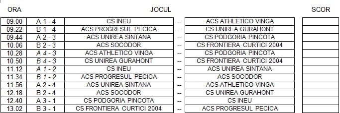 Mai sunt două săptămâni până la reluarea întâlnirilor pe puncte în Liga 4-a, iar cinci dintre formații au șansa să-și adauge un trofeu în vitrină. Unirea Sântana, CS Ineu, Progresul Pecica, ACS Socodor și Frontiera Curtici par a avea o șansă în plus față de divizionarele cinci, Podgoria Pîncota și Unirea Gurahonț și mai ales față de formația de Liga 6-a, Athletico Vinga, de a deveni cea mai bună echipă la futsal.