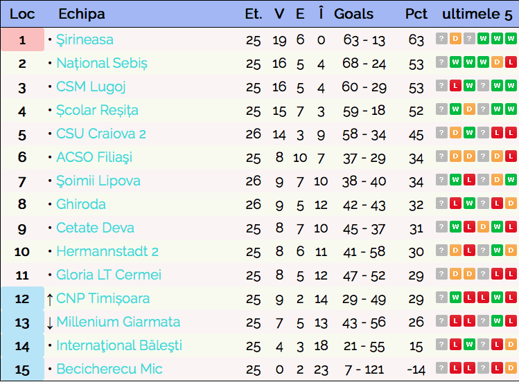 Liga III-a (seria 4-a): Reșița cade în afara podiumului, Șirineasa ar rămâne în frunte chiar și cu penalizarea de 9 puncte