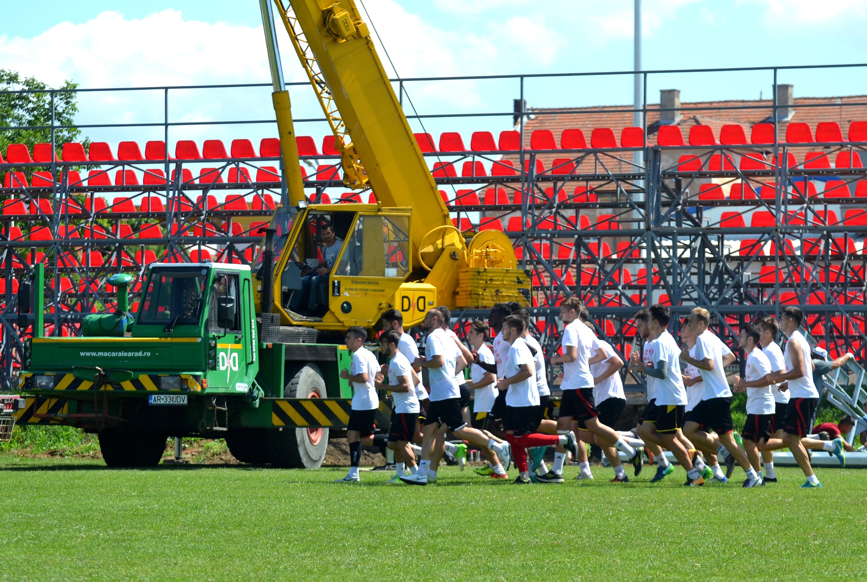 Angajații societății comerciale din Galați s-au apucat de azi de treabă cu utilaje închiriate deocamdată din Arad, directorul tehnic al companiei fiind optimist în ceea ce privește termenul de finalizare. „Din momentul acesta avem nevoie de20 de zile, fără ploaie. Nu e tocmai ușor, mai ales că ne propunem să facem o muncă de calitate. Până la montarea propriu-zisă a gazonului sintetic,  mai avem de pus două straturi, respectiv geotextilul și shockpad-ul de amortizare.  În primă etapă, lucrăm cu 5 muncitori, pentru ca apoi, când trecem la trasat și lipit, să avem nevoie de mai mulți. Zilele următoare, pentru faza a doua a lucrării, vor mai veni și doi-trei operatori pentru utilajele de umplere. Dacă vremea ține cu noi, nu vedem cum să nu ne terminăm treaba cel târziu până la 1 august, noi sperăm și mai repede”, a menționat Cosmin Stroia, care se va mai intersecta și cu operațiunea de montare a țevilor și aspersoarelor pentru sistemul de irigații necesar la temperaturi foarte ridicate.