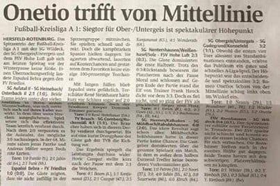 În ultima etapă, cea din weekend, arădeanul Onețiu a înscris un gol extrem de important pentru echipa sa cu o execuție de la mijlocul terenului. Totul a fost consemnat în ziarul regional (foto2), iar prin victoria cu 3-2 în fața celor de la Sg Gudegrund, Ober Untergeis a rămas în cursa pentru promovarea în Liga 6-a. Rămâne de văzut dacă fostul coleg al lui Man sau Petre va fi implicat până la final în această luptă și asta pentru că evoluțiile sale au atras atenția unor grupări din eșaloanele superioare germane.