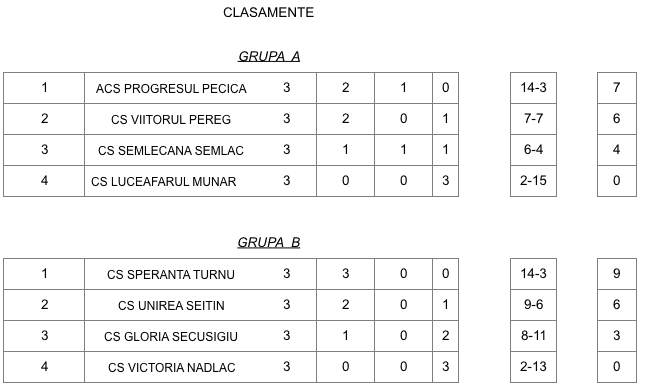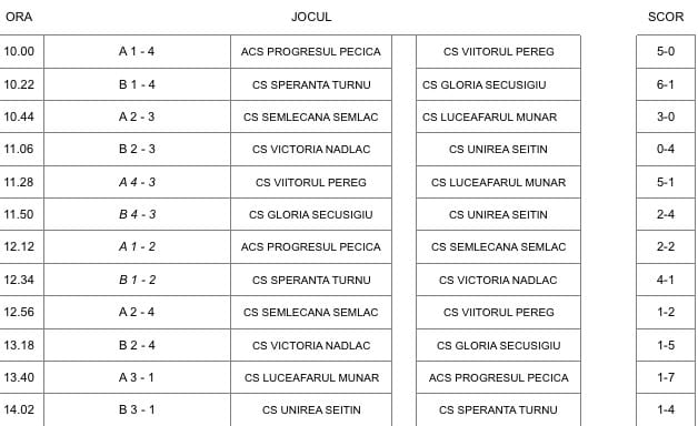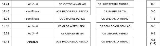 Dar până una alta, vă prezentăm tabloul întrecerii arbitrată de Sebastian Mako și Ciprian Pătroi și supervizată de Leontin Buda și Andras Mako: