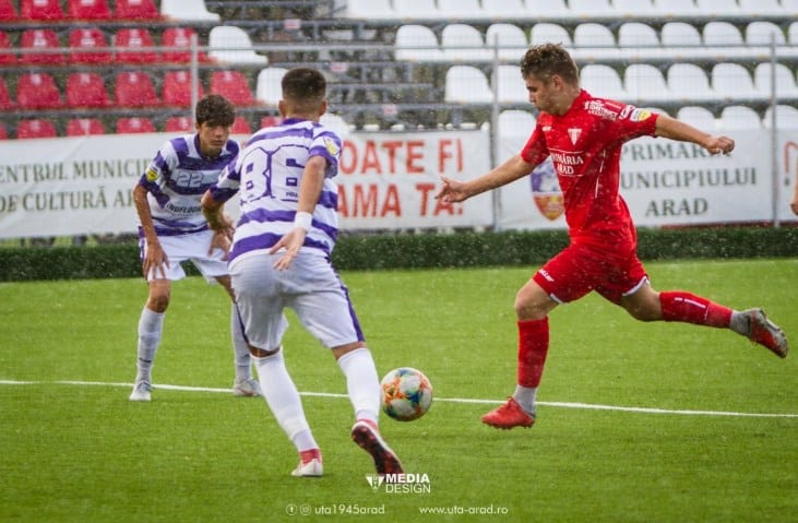 În primul meci din Aradul Nou, de la ora 16, UTA U19 era favorită în fața vecinilor din Banat, care au acumulat doar 1 punct în startul noii ediții a Ligii Elitelor. Iar trupa lui Gaica și Ungur s-a dezlănțuit și a înscris încă din prima repriza nu mai puțin de cinci goluri. Și-au trecut pe rând numele pe lista marcatorilor Șimon (foto, hattrick), Dardai și Rădulescu. În partea a doua UTA a continuat să preseze, reușind să mai marcheze de patru ori prin: Boștină, Haloș, Merian și Răzban.