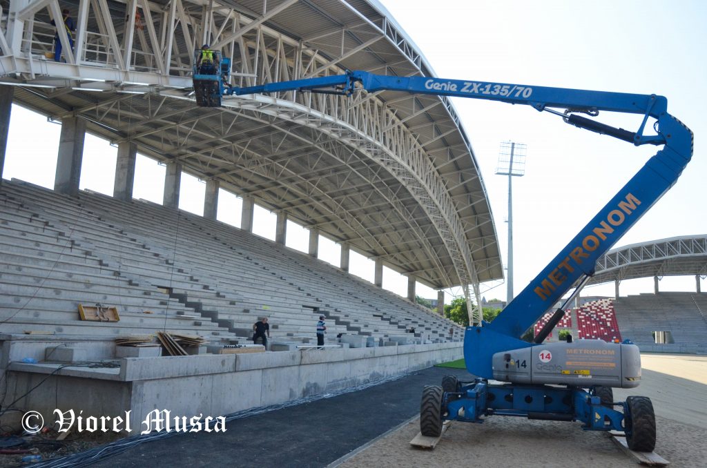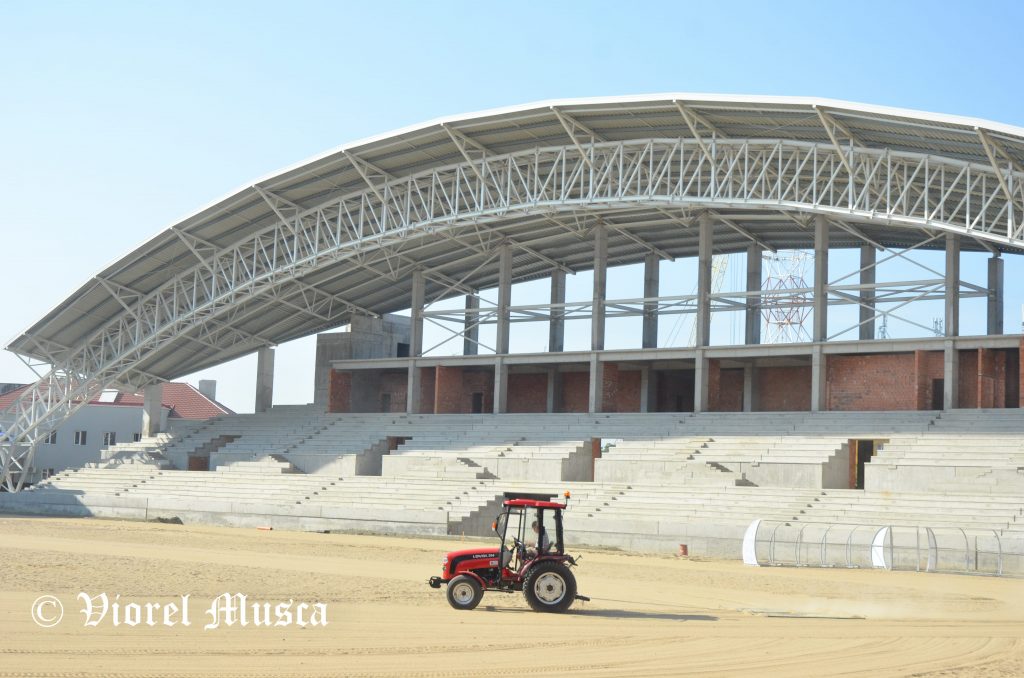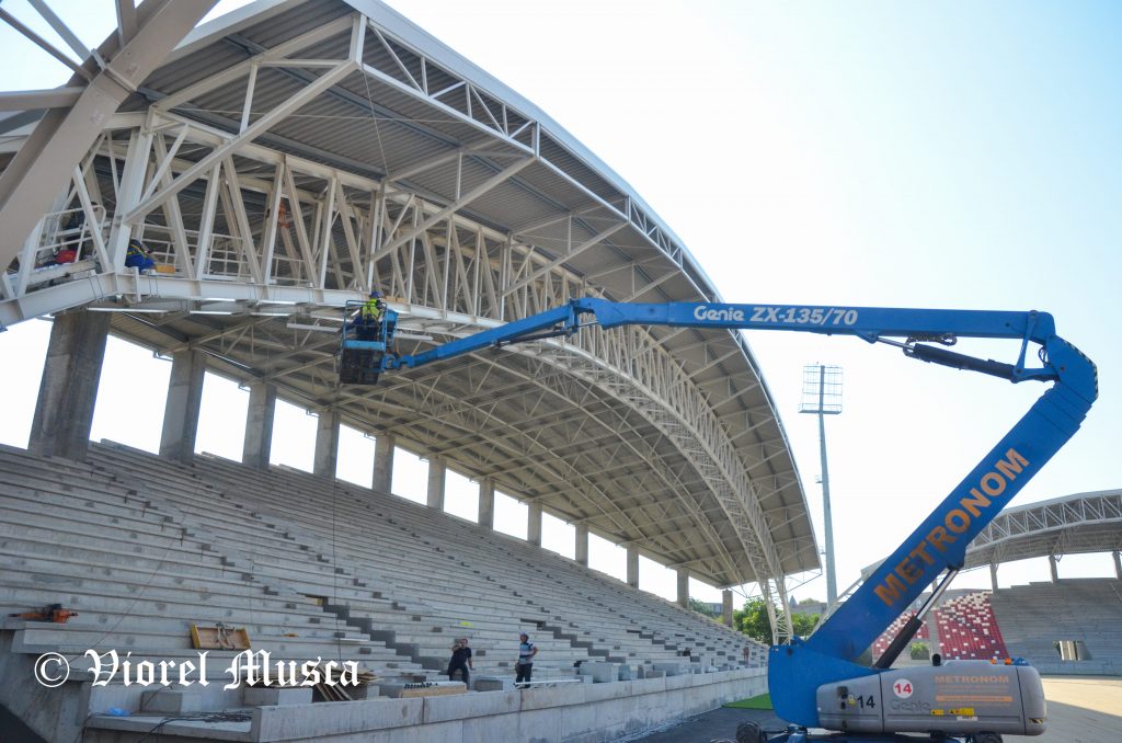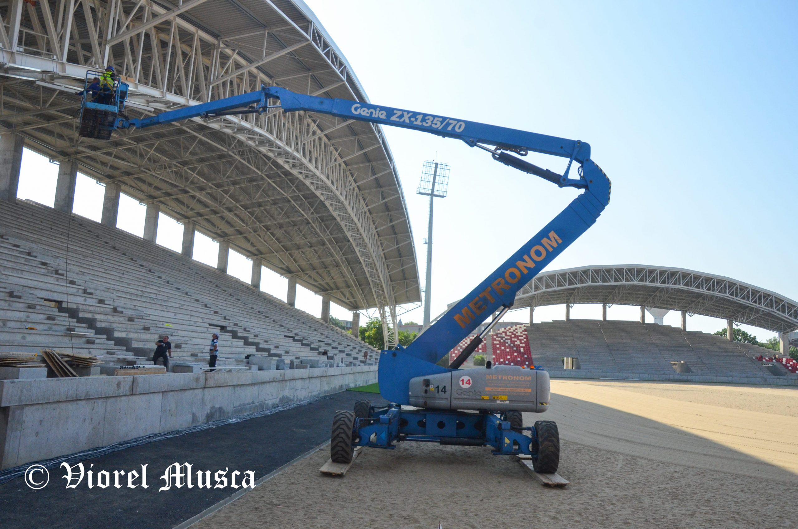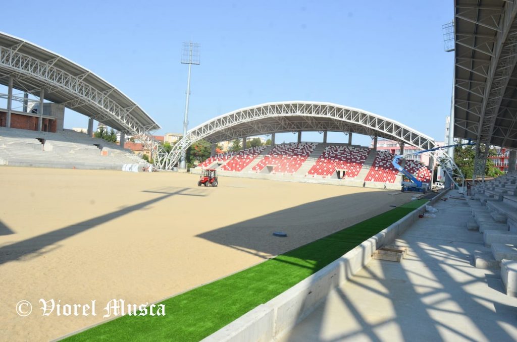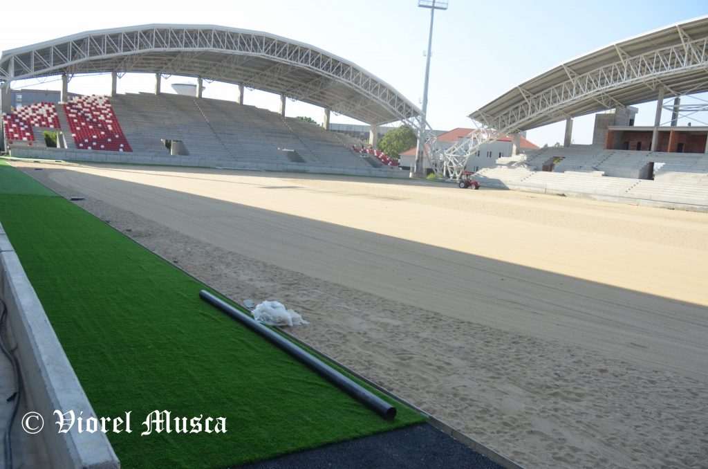 Tot legat de partea electrică, s-a început montarea podului de acces de pe coronamentul tribunelor și peluzelor în vederea fixării instalațiilor de nocturnă. La nivel de gazon se fac ultimele preparative pentru ca firma din Giurgiu să „atace” în sfârșit și partea verde a arenei. Deocamdată, pe margini au apărut doar covoarele sintetice ce delimitează suprafața de joc. Vă reamintim că la începutul acestei săptămâni, primarul Călin Bibarț a afirmat că e chestiune de zile până când caietele de sarcini cu licitațiile pentru lucrările sau achizițiile finale la arena din Francisc Neuman vor fi urcate pe SEAP, menționând – totodată – că se va putea munci și pe timp de iarnă atâta timp cât „obiectivele” nu sunt din beton.