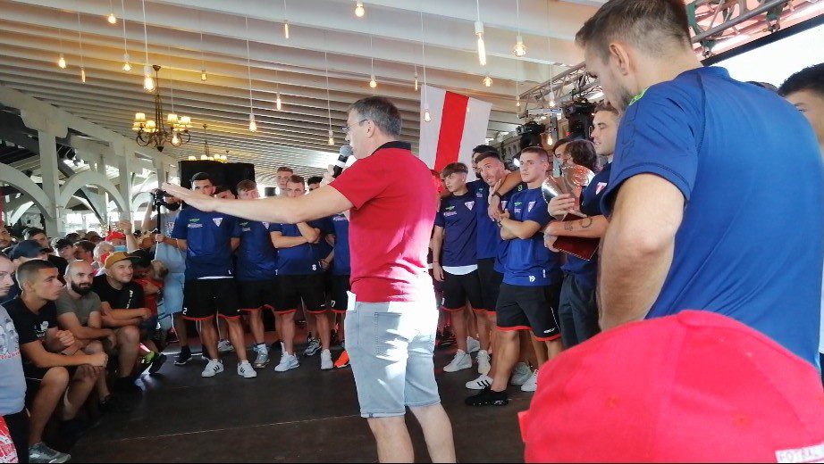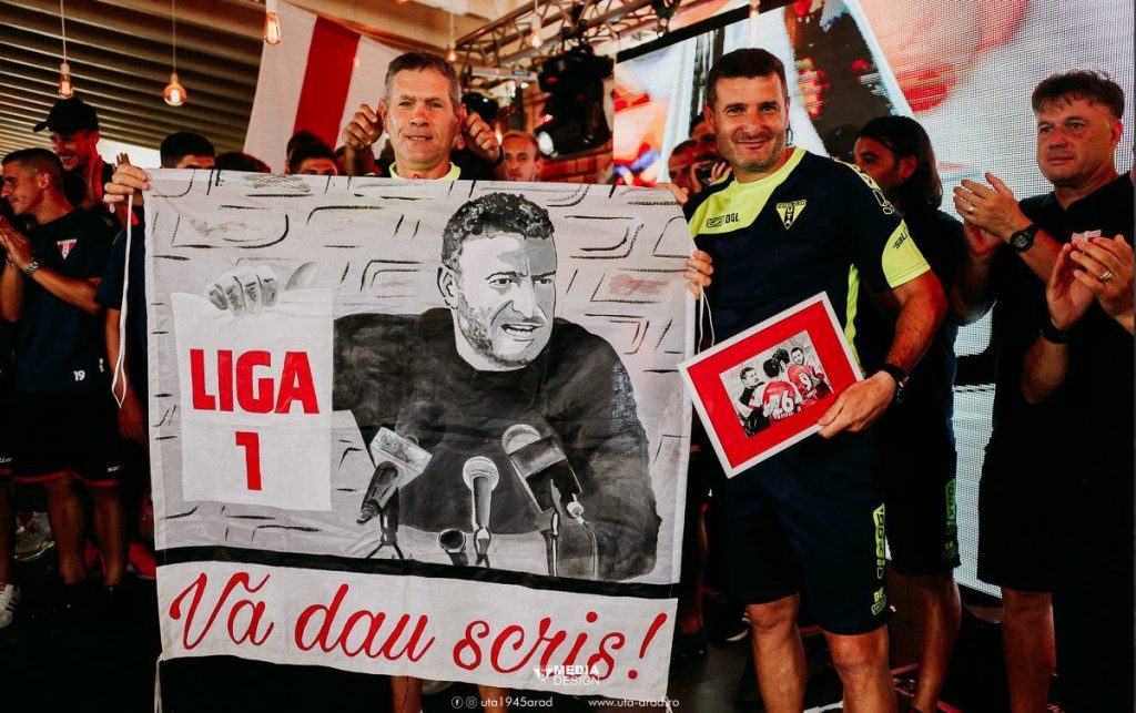Însă, tonul scandărilor a crescut când pe scenă a urcat Laszlo Balint, care și-a primit – în sfârșit – portretul de pe pânză ce-l înfățișează în fața microfoanelor, alături de explicația ”Liga 1- Vă dau scris!”. Fanii au mai înrămat și o poză cu antrenorul utist îmbrățișându-și elevii și mesajul: ”Vă mulțumim că ne-ați demonstrat că încă mai există antrenori implicați cu pasiune, cu suflet pentru echipă, care nu se teme de nimic”. Iar Balint a luat microfonul: „Vă mulțumesc pentru primire și de încrederea acordată. Când am semnat cu UTA, m-am angajat să fac și să reușim ceea ce puțini credeau că se va întâmpla din primăvara anului trecut încoace. Îi am pe băieții aceștia lângă mine și de multe ori am vorbit în acest sezon despre noțiunea de spirit. Iar în interiorul vestiarului am fost o familie, iar o familie trebuie să fie unită și să muncească. Și până la urmă, de fapt, noi am fost doar o parte din familie, iar ceea ce ne-a dat valoare a fost pasiunea și sufletul pe care l-au pus băieții aceștia în munca depusă zi de zi. Cu atât mai mult cu cât a fost un sezon special, lung, desfășurat pe parcursul a 13 luni. Dar, pe lângă toate astea, căldura cu care ne-ați înconjurat în momentele bune, dar mai ales în momentele mai puțin bune, a contat enorm. Vorbim de spiritul acestui club și de un imn cu atâta greutate, unul dintre cele mai frumoase cântate în fotbalul din România, . Aș vrea ca toată lumea să se bucure de această performanță pe care am realizat-o, dar, pe de altă parte, aș vrea să se înțeleagă că e doar un capitol pe care l-am scris, e un prim pas spre a deveni din nou importanți în fotbalul românesc. Ne dorim să progresăm și sunt convins că atunci când vă vom avea din nou alături de noi, pe stadion, cel puțin aici, la Arad, o să fim invincibili. Am demonstrat-o și sunt convins că putem realiza acest lucru și la nivel de Liga 1. Vă mulțumesc!”