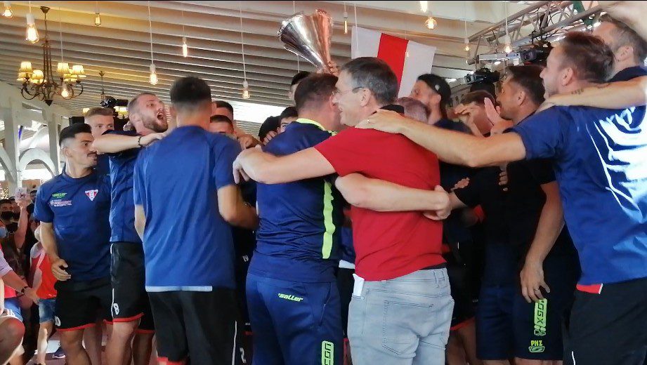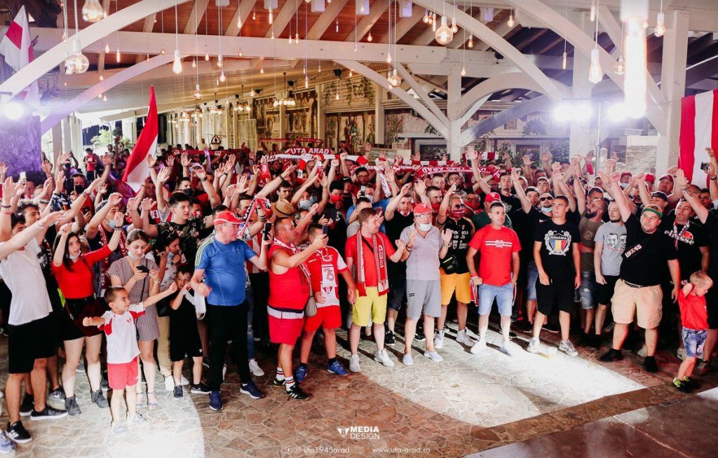 A fost sărbătoare în toată regula pe terasa restaurantului Marem, acolo unde conducerea clubului arădean a montat și o scenă pentru băieții lui Balint. S-au aprins torțe și fumigene la coborârea campionilor din autocar, iar galeria a dat tonul scandărilor: „Cine e pe primul loc, cine e pe primul loc, UTA e!”. După ce li s-a luat temperatura și s-au dat cu dezinfectant pe mâini, suporterii Campioanei Provinciei au ajuns în zona scenei, unde a început showul. După refrenul de la ”Dunăre la Sena” cântat din piepturile celor peste 200 de susținători utiști de toate vârstele, mc-ul Cătălin Lăpușcă i-a chemat rând pe rând pe proaspeții campioni ai Ligii a 2-a. Începând de la maseuri și terminând cu antrenorul Laszlo Balint și managerul Alexandru Meszar.