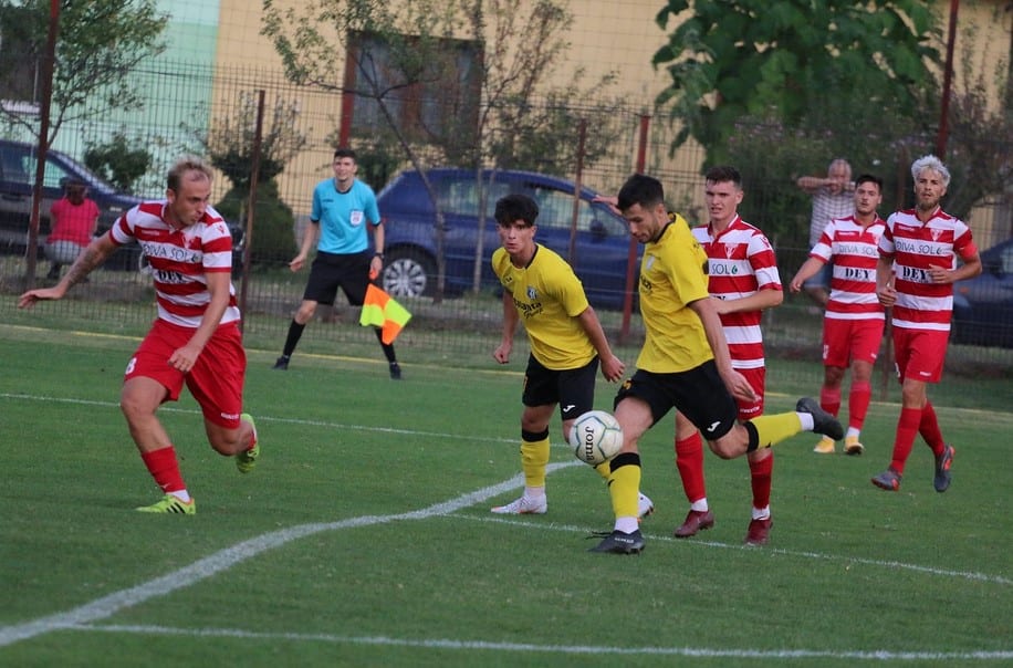 Min. 1: A început partida de la Caransebeș, gazdele evoluează în roșu-negru, Pecica în galben-albastru