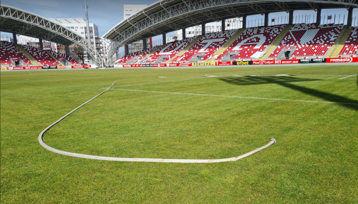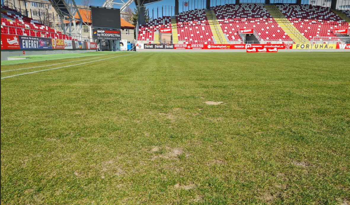 Furtunul s-a făcut stăpân pe gazonul de pe „Francisc Neuman”! Petrache: „Nu e o mare problemă repararea sistemului de irigare, dar nu am fost solicitați!”