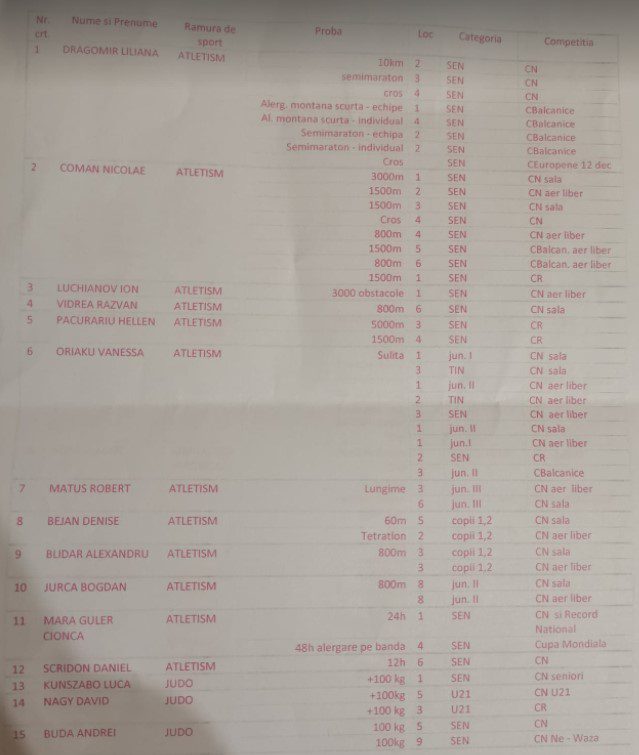 4. Nicolae Coman (atletism – seniori) – Locul 1 la 3000m și Locul 3 la 1500m (CN sală); Locul 2 la 1500m, Locul 4 la 800m (CN aer liber); Locul 4 la Cros (CN); Locul 5 la 1500m și Locul 6 la 800m (Campionat Balcanic aer liber); Locul 1 la 1500m (Cupa României)