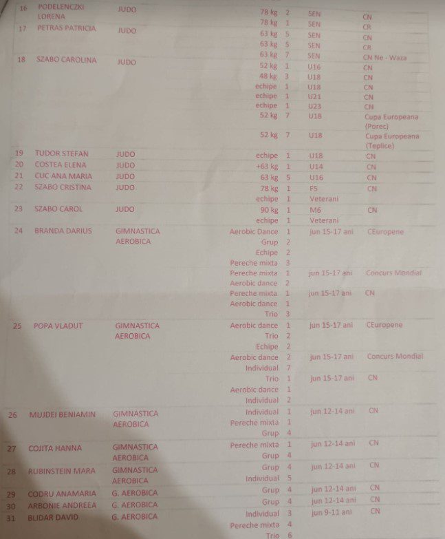 6. Carolina Szabo (judo) – Locul 1 la 52kg U16, Locul 3 la 48kg U18, Locul 1 la echipe U18, Locul 1 la echipe U21, Locul 1 la echipe U23 (CN); Locul 7 la 52kg U18 (Cupa Europeană – Porec); Locul 7 la 52kg U18 (Cupa Europeană – Teplice)