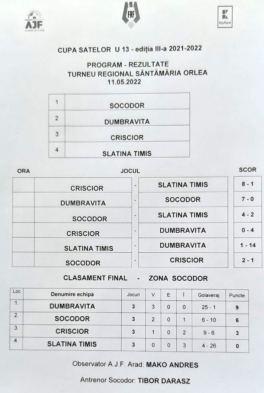 În organizarea FRF și a AJF Hunedoara, la baza sportivă din localitatea Sântămaria Orlea (județul Hunedoara) s-a desfășurat Turneul semifinal al Cupei Satelor Under 13, ediția a treia. Județul Arad a fost reprezentat de echipa comunei Socodor, câștigătoarea fazei zonale, care a ocupat un onorant loc doi, după următoarele rezultate: 0-7, cu Dumbrăvița (jud. Timiș), 4-2, cu Slatina Timiș (jud. Caraș-Severin) şi 2-1, cu Criscior (jud. Hunedoara). Golurile echipei antrenate de Tibi Darazs au fost semnate de Hamza (4), Vidican și Toma.