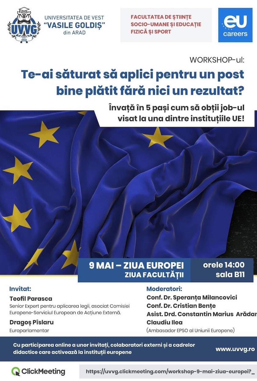 Cu această ocazie, echipele din cadrul facultății au organizat două workshop-uri menite să atingă atât subiecte care vizează cunoașterea și gândirea modernă europeană, cât și, pe de altă parte, sincronizarea cu piața forței de muncă și șansele de inserție profesională ale absolvenților, în cadrul unor organisme europene.