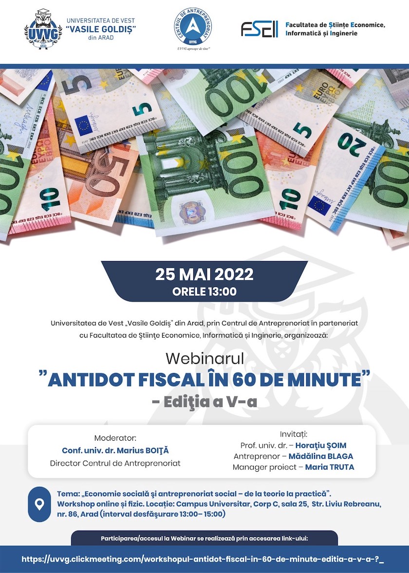 Sub egida „Zilelor Academice Arǎdene”, în sistem hibrid (fizic şi online), în Campusul Universitar al Universitǎţii de Vest „Vasile Goldiş” din Arad, a avut loc ediţia cu numărul 5 a webinarului „Antidot fiscal în 60 de minute”.Organizat de Universitatea de Vest „Vasile Goldiş” din Arad, prin Centrul de Antreprenoriat UVVG, ȋn parteneriat cu Facultatea de Științe Economice, Informatică și Inginerie, evenimentul i-a avut ca invitaţi pe prof. univ. dr. Horaţiu Şoim, invitat permanent, Mădălina Blaga, antreprenor, Maria Truţa, manager proiect şi Laura Andreş – preşedintele Asociaţiei Oaza Arad şi preşedintele sucursalei Arad a Colegiului Naţional al asistenţilor sociali.