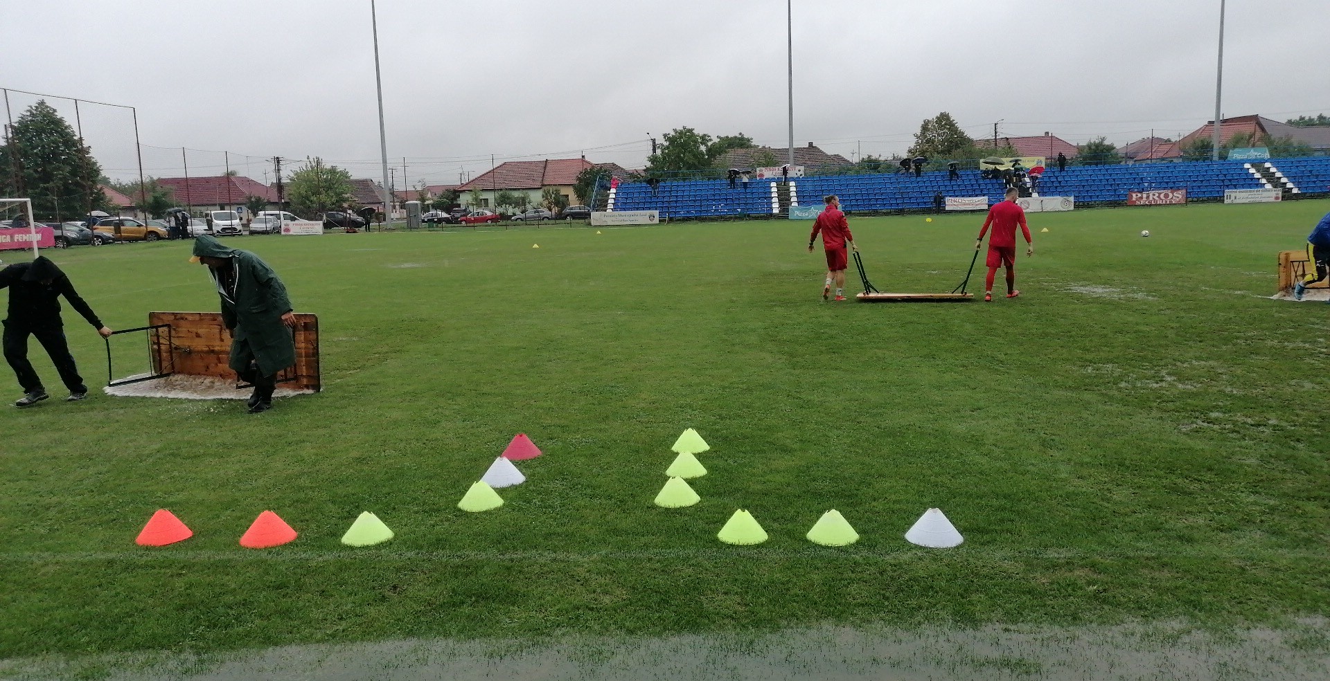 Update 17:20 – Meciul tot nu a început, organizatorii încă se chinuie să îndepărteze apa cu ajutorul meselor de lemn, dar continuă să plouă la Arad. Arbitrii au reintrat în vestiar, cel mai probabil meciul se va juca mâine, la aceeași oră, pe același stadion.