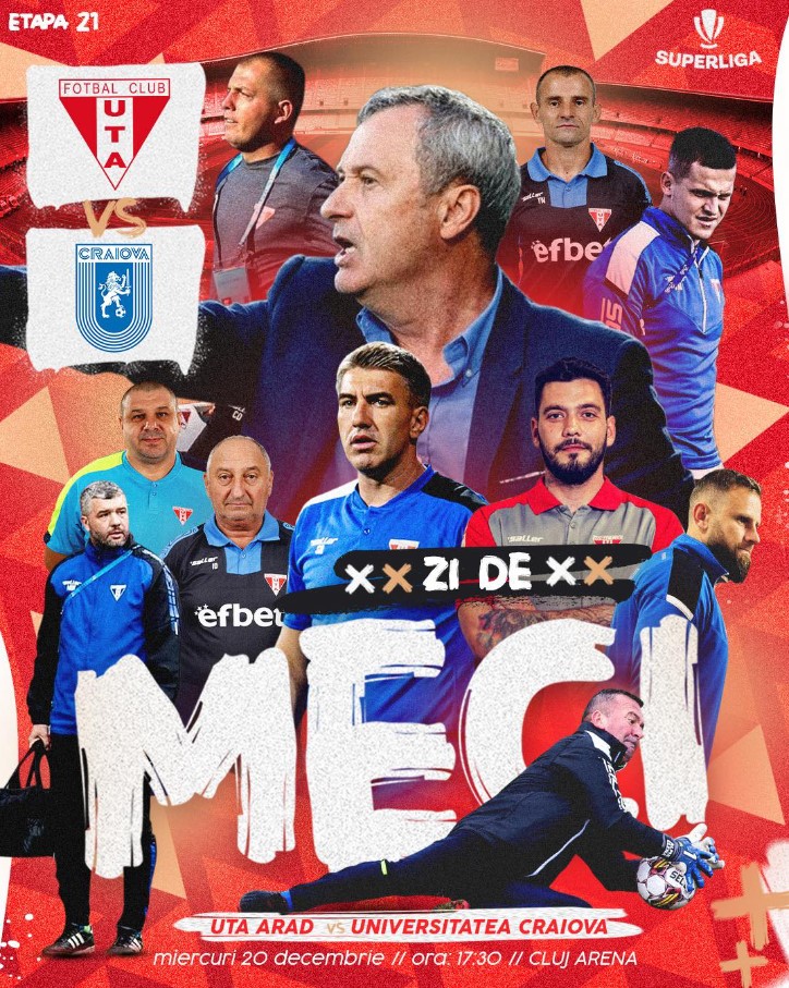Însă, gruparea arădeană pare supărată pe toți jucătorii, din moment ce pe afișul de meci postat pe contul oficial de Facebook apar doar Mircea Rednic, „secunzii” săi, doctorul și maseurii. Și aceștia din urmă au, la rândul lor restanțe bănești, dar au înțeles situația și s-au prezentat normal la program luni. De partea cealaltă, în imaginea celor de Universitatea Craiova legată de ziua meciului cu UTA apar 6 jucători din lot. Reacția fotbaliștilor „Bătrânei Doamne” va putea fi urmărită începând cu ora 17,30 în direct pe Digi Sport, Orange Sport și Prima Sport.