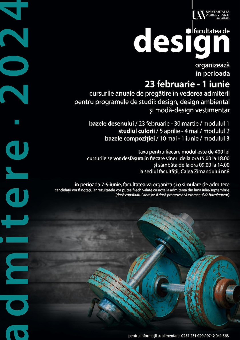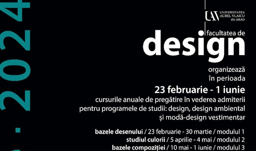 Dacă vrei să fii student la Facultatea de Design din cadrul Universității „Aurel Vlaicu” din Arad ai ocazia de a face pregătiri cu profesorii facultății în perioada 1 martie-1 iunie la sediul din Calea Zimandului, nr.8 (cartier Grădiște).