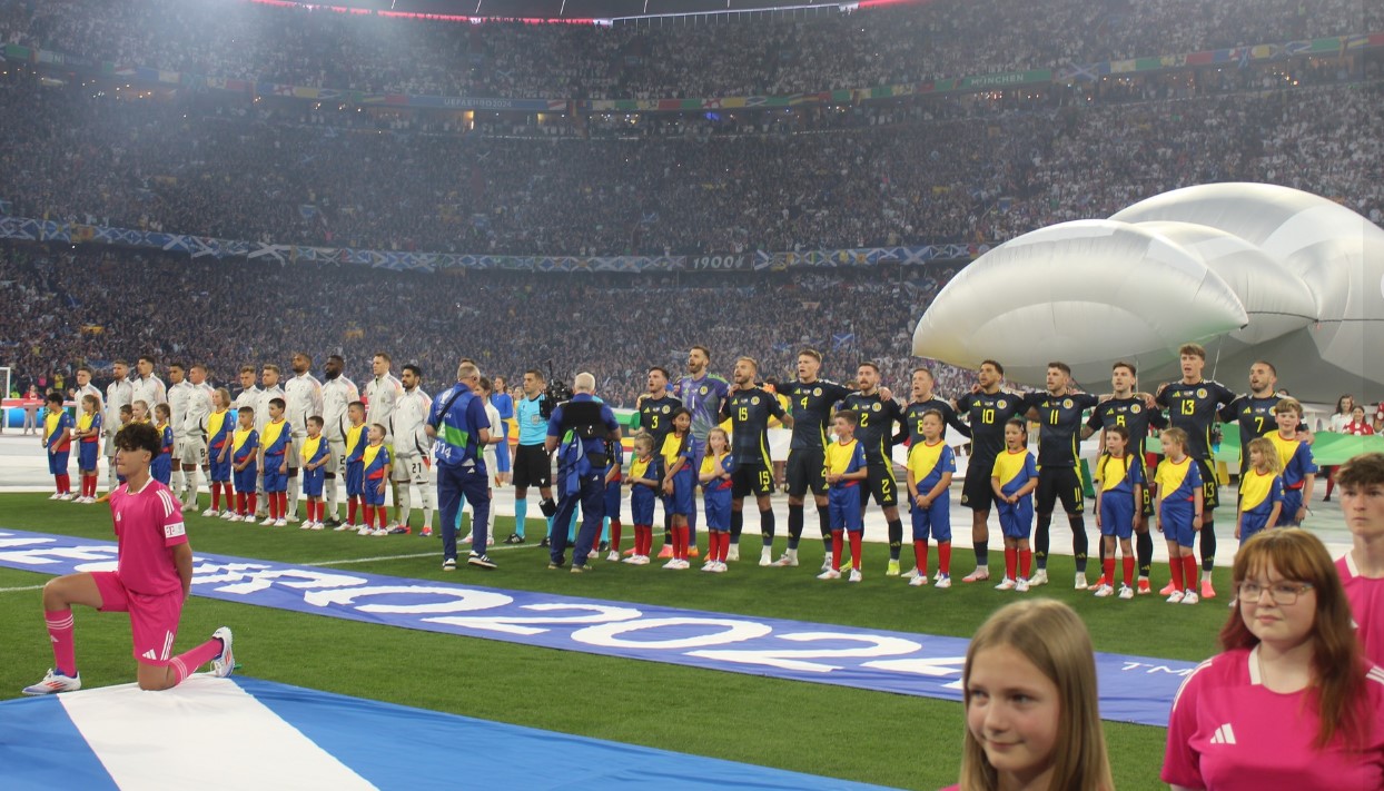 Heidi Beckenbauer a fost însoțită de Bernard Dietz și Juergen Klinsmann, căpitanii echipelor care au câștigat Euro 1980 și Euro 1996, pentru a aduce pe teren Cupa Henri Delaunay, trofeul care va fi înmânat echipei ce va triumfa la Euro 2024. Timp de două minute, fanii nemți și scoțieni au aplaudat călduros în memoria legendei Germaniei.