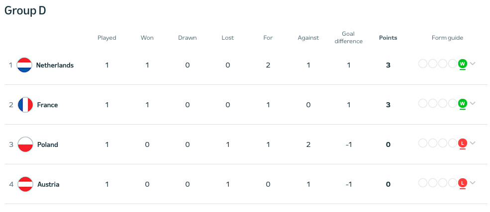 Starul Kylian Mbappe era în căutarea primului gol la un turneu final european, dar a trebuit să se mulțumească cu pasa din care Wober și-a bătut propriul portar cu o lovitură plasată de cap. Era minutul 38 și francezii s-au mulțumit să controleze tactic partida, cu toate că a riscat la pătrunderea lui Baumgartner, rezolvată de Magnan cu prețul unei accidentări.