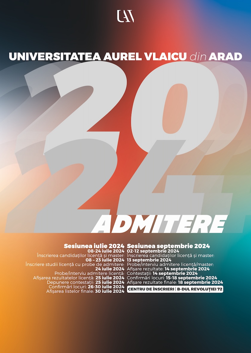 Înscrierile la Universitatea „Aurel Vlaicu” din Arad vor avea loc în perioada 8-24 iulie pentru specializările la care admiterea se va face pe bază de dosar și 8-23 iulie la facultățile unde candidații trebuie să susțină probe de admitere. E vorba despre Facultatea de Inginerie Alimentară Turism și Protecția Mediului (pentru noua specializare Nutriție și dietetică), Facultatea de Educație Fizică și Sport (programul de studii Educație fizică și sportivă), Facultatea de Științe Umaniste și Sociale (la programele de studii Muzică și Interpretare muzicală-canto), Facultatea de Design și Facultatea de Teologie Ortodoxă, la fiecare dintre acestea fiind prevăzute probe sau examen de admitere.