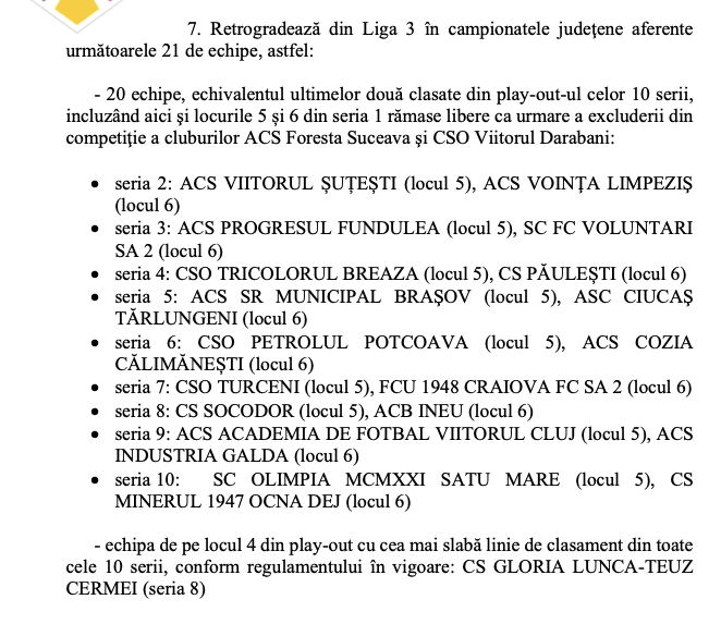 Surpriză neplăcută pentru Gloria Lunca Teuz Cermei, care a fost informată de Federația Română de Fotbal, în urma ședinței de Comitetului de Urgență a FRF, că a retrogradat la finalul sezonului 2023-2024. „Sămădăii” terminaseră play-outul seriei 8-a a Ligii a III-a pe locul 4, peste linie, dar e informată dinspre Casa Fotbalului: ”Echipa de locul 4 din play-out cu cea mai slabă linie de clasament din toate seriile, conform regulamentului în vigoare – CS Gloria Lunca Teuz Cermei (seria 8)”