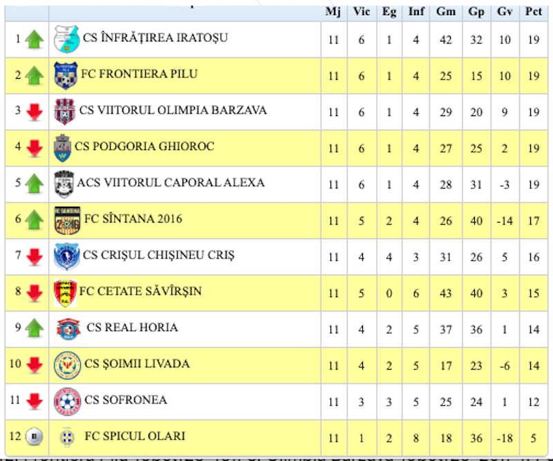 Desfășurare inedită a turului Ligii a 5-a (seria B), cu nu mai puțin de cinci echipe ce împart fotoliul de lider cu același număr de puncte. Iratoșu și Pilu au chiar aceeași diferență la golaveraj (+10), Înfrățirea fiind prima pe baza criteriului golurilor mai multe marcate. Bârzava, Ghiroc și Caporal Alexa sunt și ele acolo, dar despre echilibrul ce domnește în această serie vorbește și diferența dintre formațiile de pe primul loc și cea de pe poziția a 11-a (penultima), care e de doar 7 puncte (!?). Practic, doar formația din Olari e desprinsă de pluton și – probabil – va fi greu să-l mai prindă.