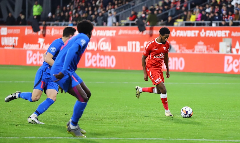 Min. 36 – Șansă bună de contraatac pentru UTA dar Omondi greșește pasa, încercând să trimită pe centru pentru Vuletich, în locul unei pase în stânga spre Mabea care urca demarcat