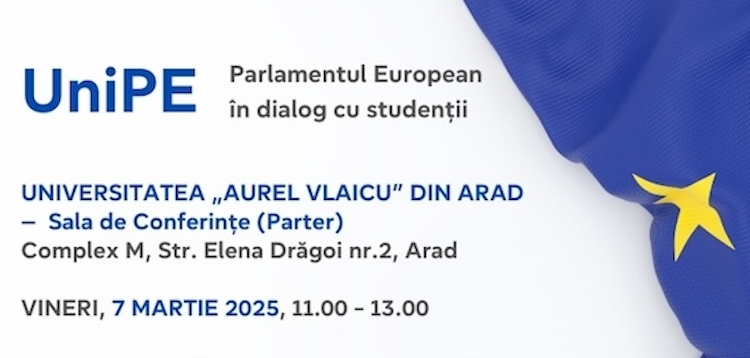 Tinerii arădeni și studenții UAV sunt invitați la dezbaterea „Dezinformarea și inteligența artificială – rolul UE în combaterea acestui fenomen”, organizată de Biroul de Legătură al Parlamentului European în România, în colaborare cu Universitatea „Aurel Vlaicu” din Arad.