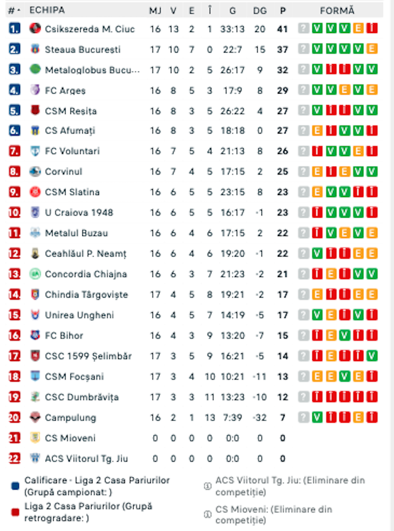 - CS Mioveni și Pandurii Târgu Jiu au fost excluse din campionat și rezultatele lor au fost anulate