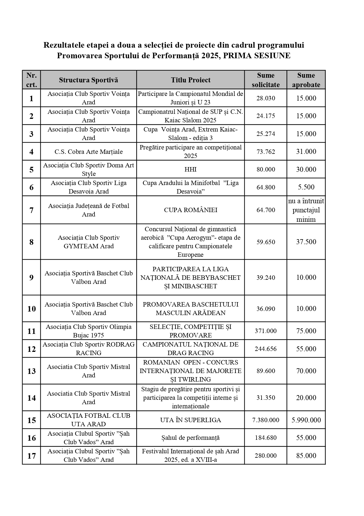Primăria Arad și-a respectat promisiunea față de cele mai iubite grupări sportive ale Aradului, dar nu și față de celalalte cluburi din municipiu. În ziua în care s-a votat bugetul Aradului pe anul 2025, primarul Călin Bibarț a subliniat faptul că va aloca o sumă record pentru cluburile sportive, de 18 milioane de lei și, însă astăzi am aflat că doar 10.844.500 de lei „pleacă” spre sportivi. Într-adevăr, așa cum ne informa Primăria prin intermediul unor grafice publicate pe Facebook, UTA a luat aproape 6 milioane de lei, iar FCC UAV Arad, 2,5 milioane de lei. Adică 1,2 milioane de euro, respectiv 500 de mii de euro.