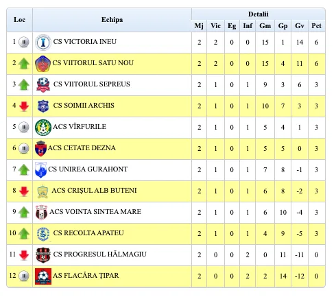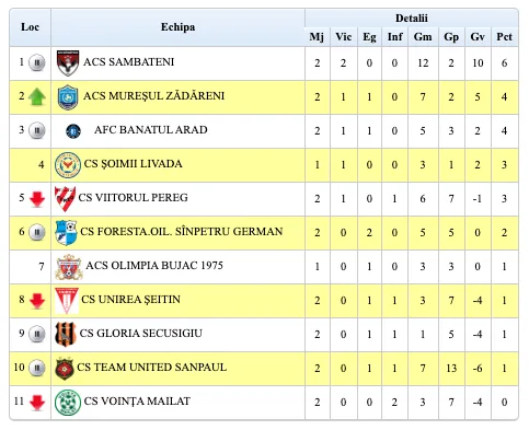 Etapa următoare (20-21 septembrie): Mailat – Secusigiu, Bujac – Livada, Sînpetru German – Șeitin, Pereg – Sânpaul, Banatul – Zădăreni. ACS Sâmbăteni va sta.