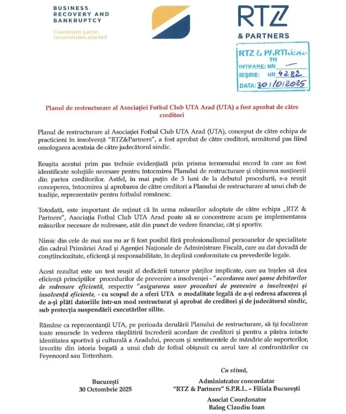 ”Planul de restructurare al Asociației Fotbal Club UTA Arad (UTA), conceput de către echipa de practicieni în insolvență “RTZ&Partners, a fost aprobat de către creditori, următorul pas fiind omologarea acestuia de către judecătorul sindic.