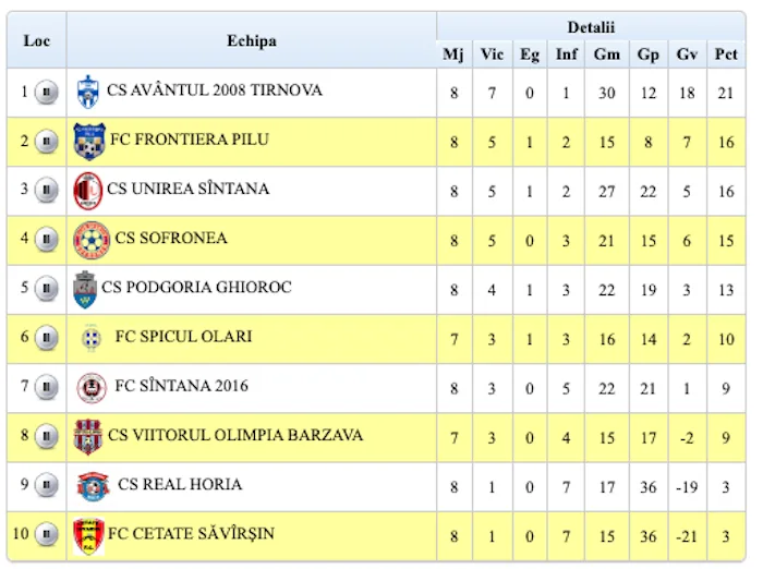 Etapa următoare (8-9 noiembrie, ora 14): FC Sântana – Târnova, Horia – Șofronea, Olari – Sântana, Săvârșin – Bârzava, Pilu – Ghioroc.