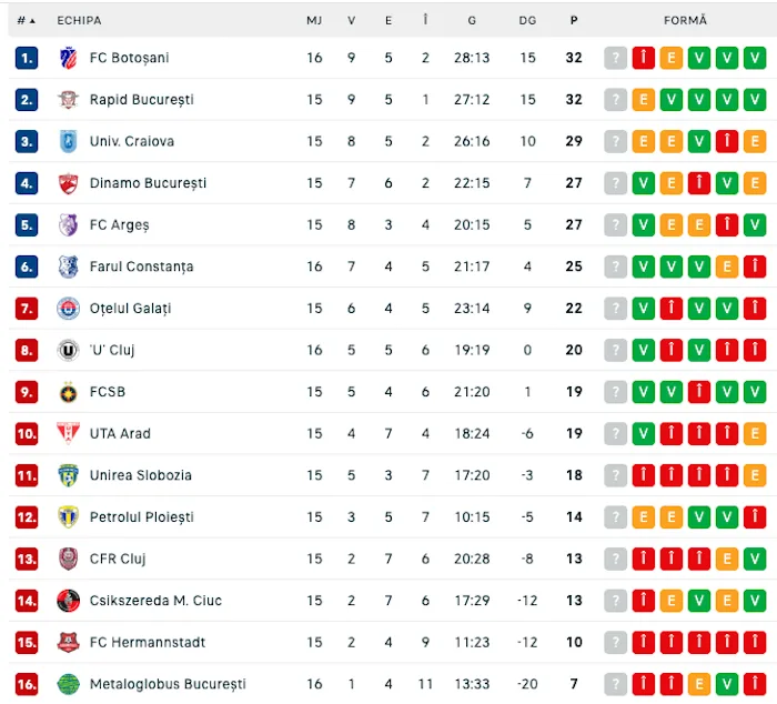 SuperLiga, etapa a 16-a: Farul oprește la 11 meciuri seria pozitivă a Botoșaniului, U. Cluj nu are probleme cu „lanterna” înainte de vizita la Arad!