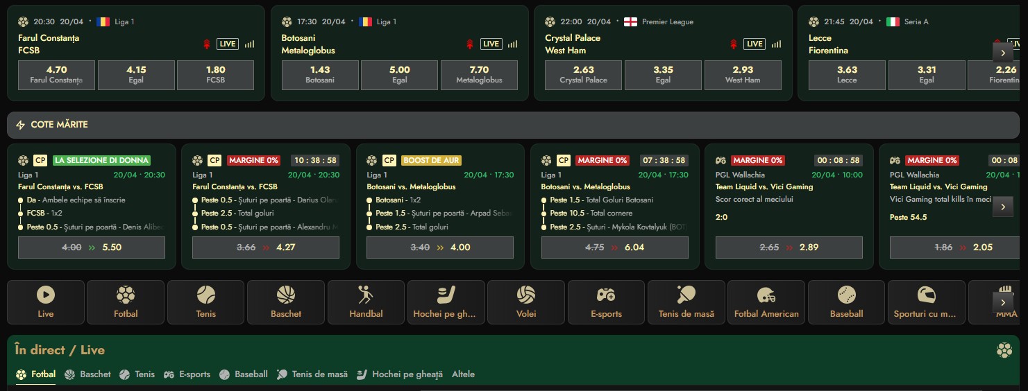 - Peste/Sub (Over/Under) – pariezi pe numărul total de goluri, puncte ori game-uri.